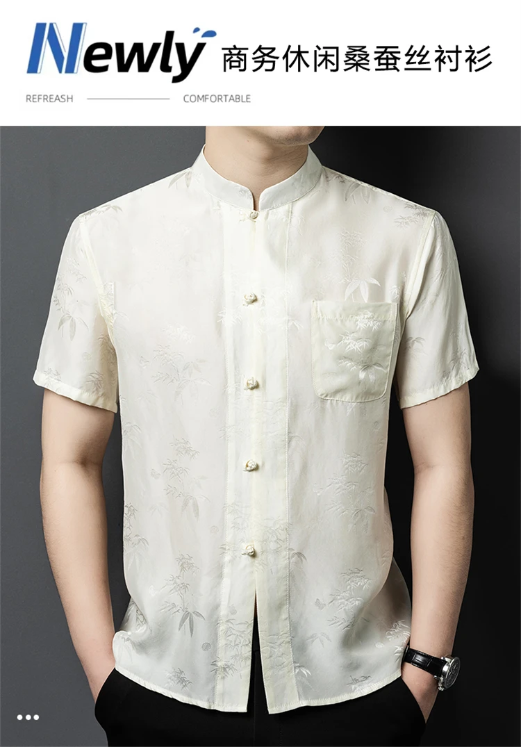 Chinese Style Silk Shirts For Men Short Sleeved Pocket Jacquard Summer Quality Soft Comfortable Satin Coolness Camisas De Hombre