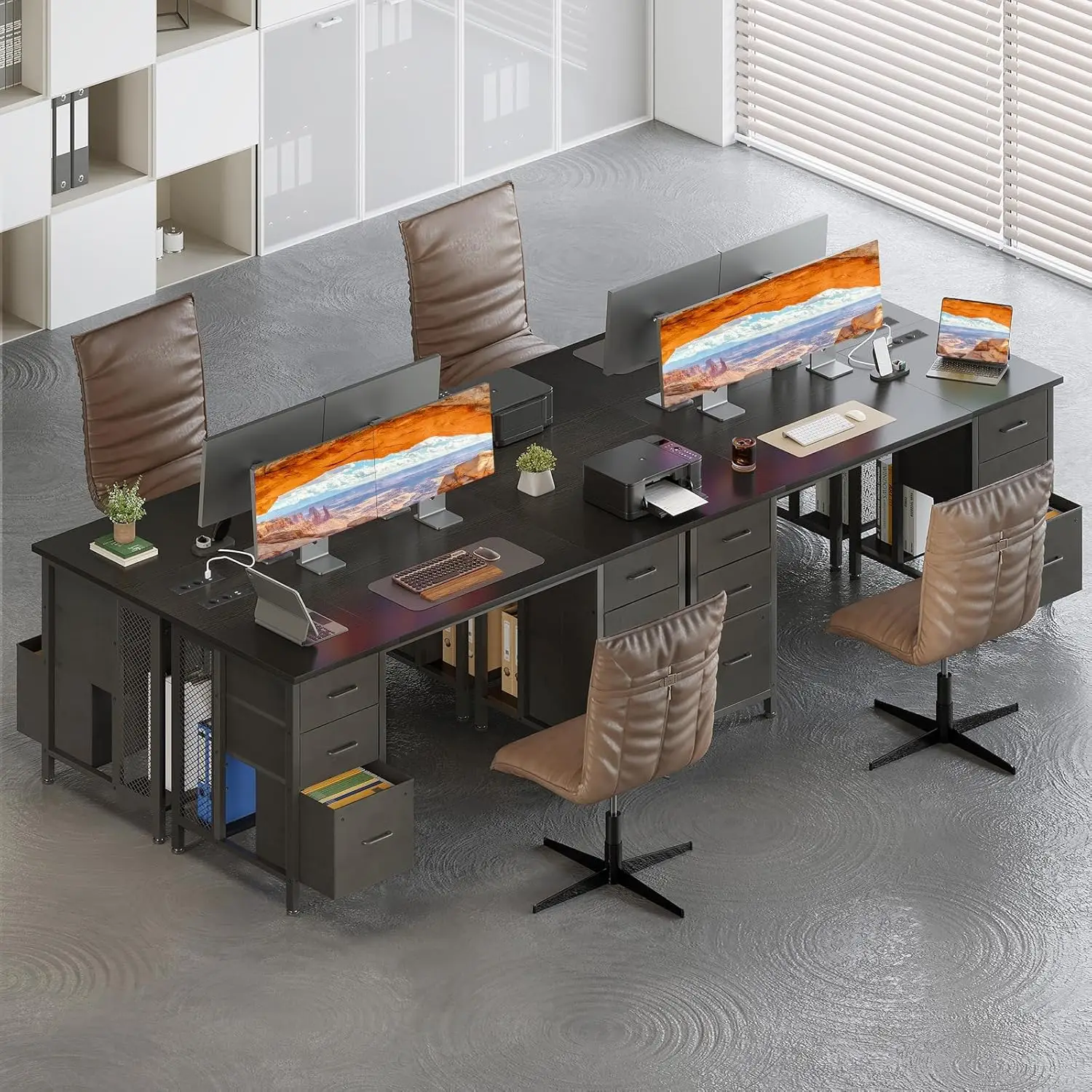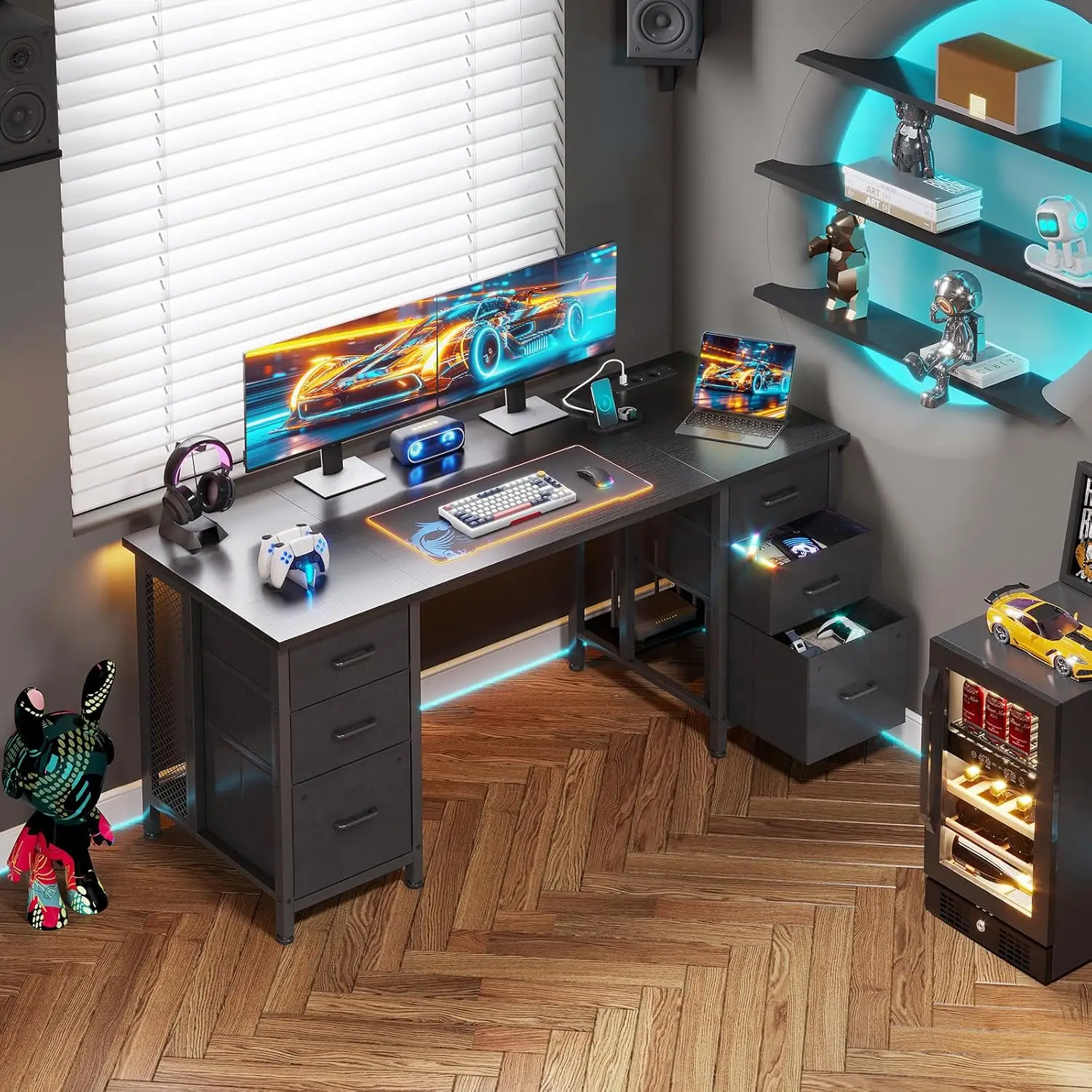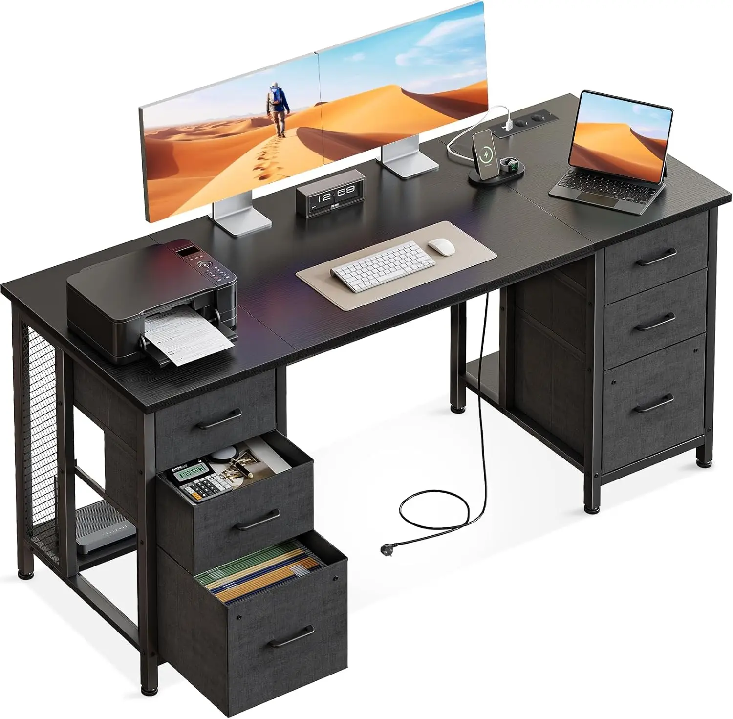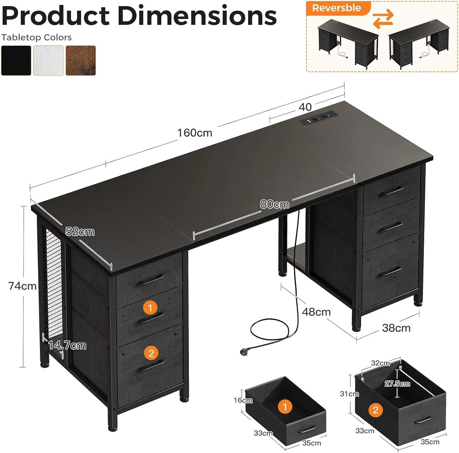 Escritorio con 6 Cajones 160x52cm Mesa Escritorio 2 Enchufes y 2 Puertos de Carga USB Escritorio Ordenador con Estantes para la